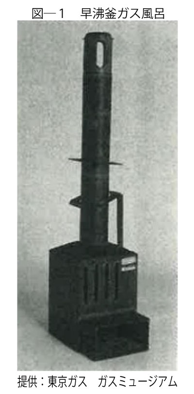 瓦斯風呂(図-1 参照)を発売しました。早沸釜ガス風呂は、沸き上がり時間の短縮、熱効率の向上、ガスの完全燃焼、逆火の絶無、点火や取扱いの簡易化、釜鳴現象の減少、高温の上がり湯、追い炊き可能など、従来のガス風呂のデメリットをほぼ解消していました。
