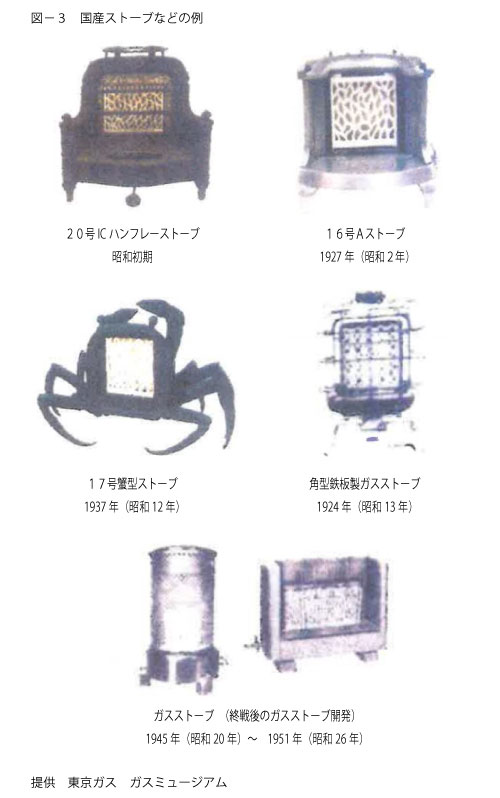 昭和時代になって比較的安い国産ガスストーブが初めて登場しました。その後、国産ストーブ(図-3 参照)も各種製造され、ガス暖房機器も次第に普及していったのです。