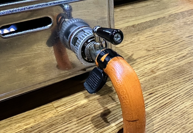 そこで、ゴム管の素材を研究して、老朽化防止とか簡単に折れないようにゴム管の中に鋼線を入れるなどして強化しました。また、ゴム管の長さを決めたうえでプラグを付け、自動的にカチッとはまるような迅速接手方式の採用など安全型接続具を開発しました。これは、一般的なホームセンターなどでの市販ルートでも販売されるようになりました。