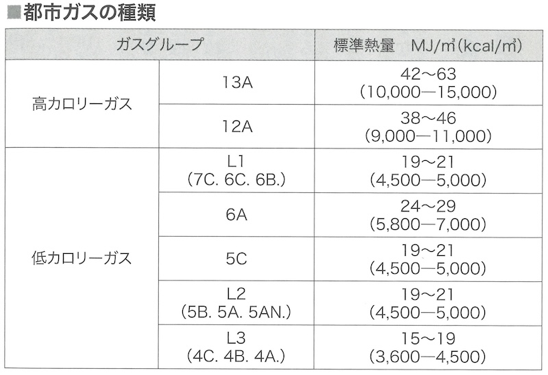 ガス種とは、熱量と燃焼速度で区別された都市ガスの種類のことで、別表に記載のごとく、天然ガス転換前までは13種類もあったのです。