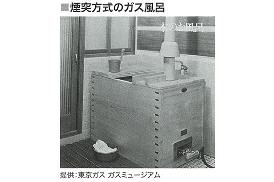 当時、日本住宅公団のガス風呂は、浴室内に内釜式木製浴槽を置き、煙突によって排気ガスを外に出す(CF式と称する)各戸別に煙突方式を採用していました。