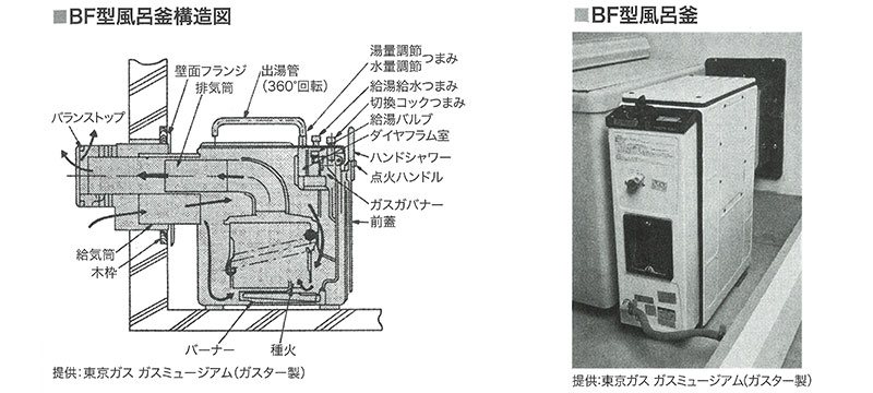 その結果、 昭和40(1965)年にBF型風呂釜(給気、排気処理を外部から取り入れるタイプ)が開発され、量産化されました。日本住宅公団では、その新製品の採用を正式決定し、住宅設計に組み込まれました。