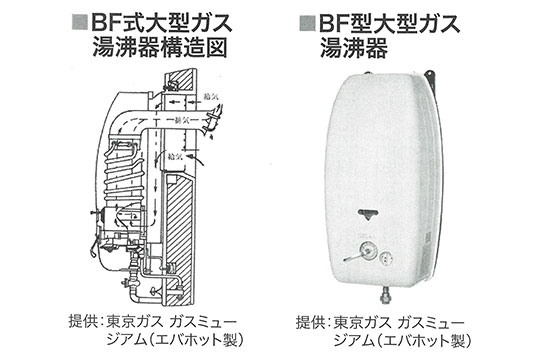 大型湯沸器は、昭和37(1962)年に、国産初のBF(バランスドフル―)型大型ガス湯沸器が発表されました。この機器は、部屋の空気を汚さず、しかも排気筒を設置する必要のない安全な湯沸器として注目を集めました。
