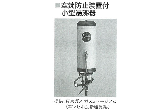 一方、小型湯沸器は、昭和30年代までは四角い形をしたものとは異なる、空焚き防止装置のついた、円筒型の湯沸器が全国各地で使われていました。